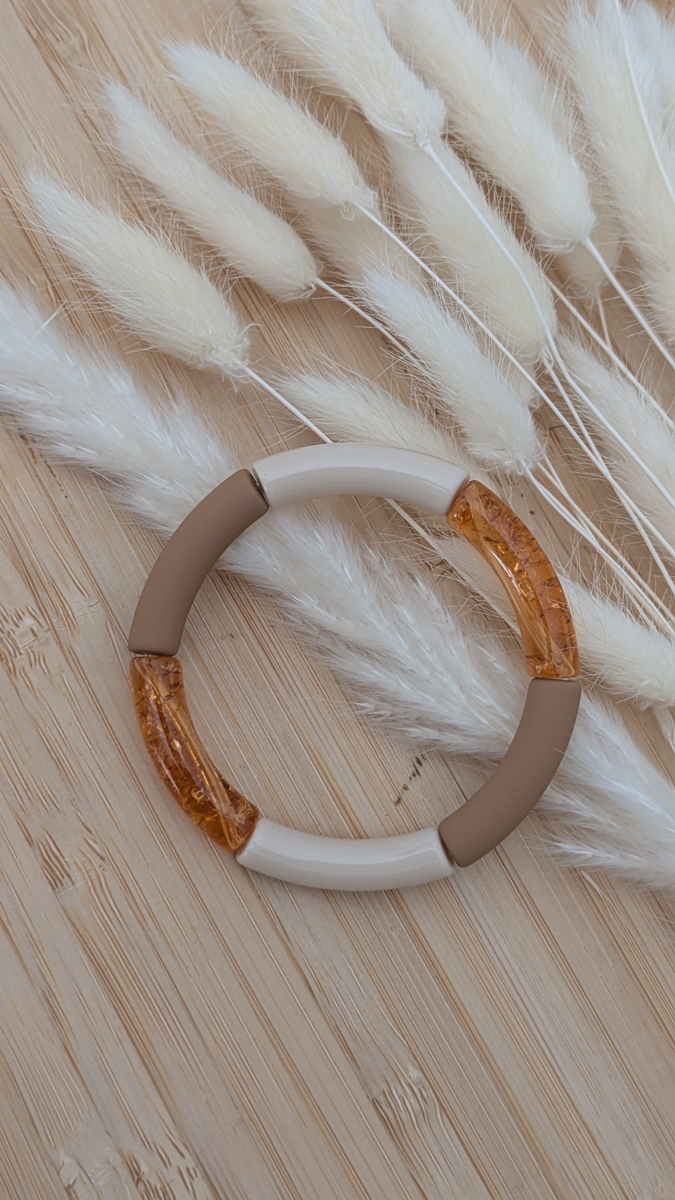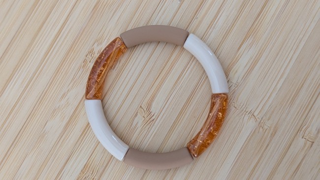 Elastique, il s'enfile facilement. Réalisé avec des perles acryliques lisses et craquelées pour un effet dynamique et texturé.