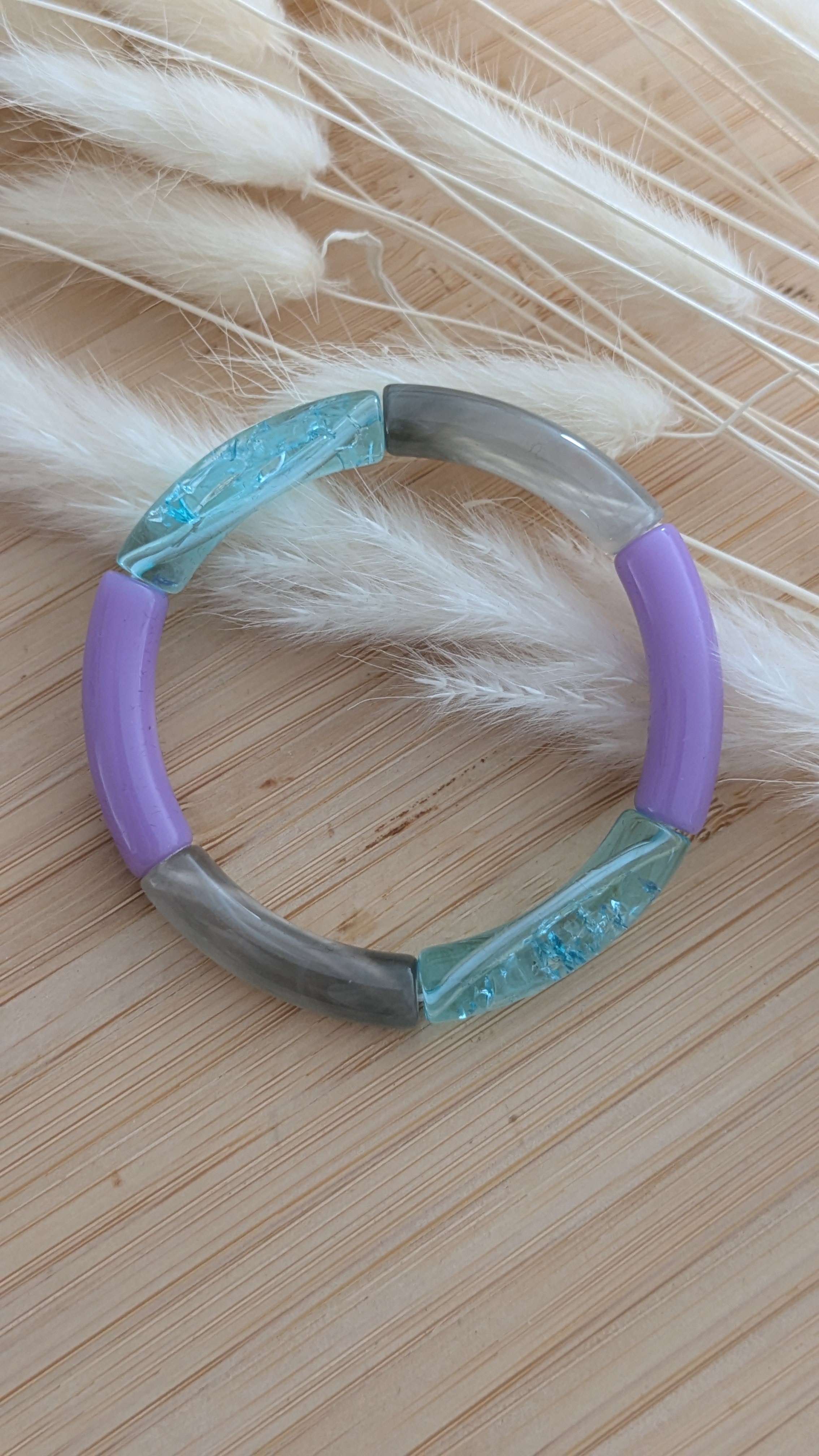 Elastique, il s'enfile facilement. Réalisé avec des perles acryliques lisses et craquelées pour un effet dynamique et texturé.