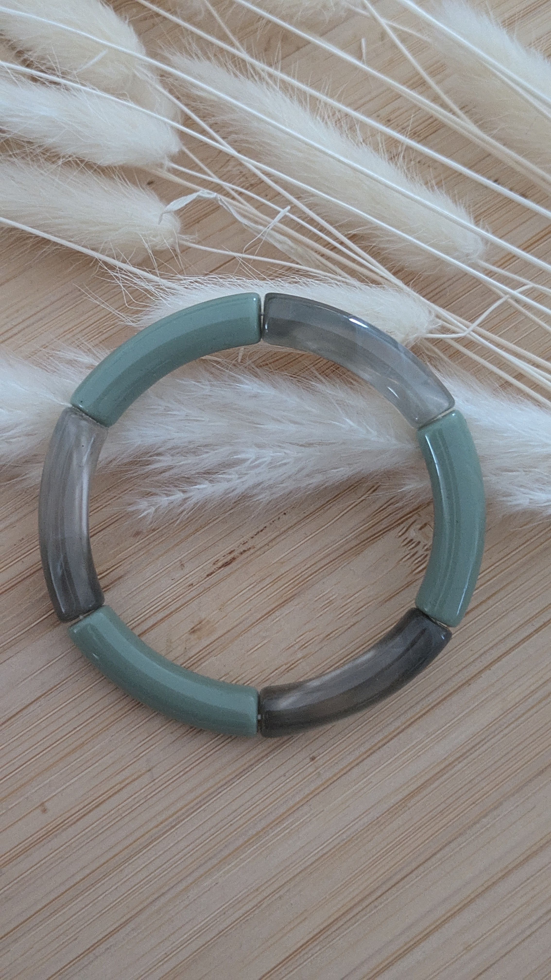 Elastique, il s'enfile facilement. Réalisé avec des perles acryliques lisses et craquelées pour un effet dynamique et texturé.