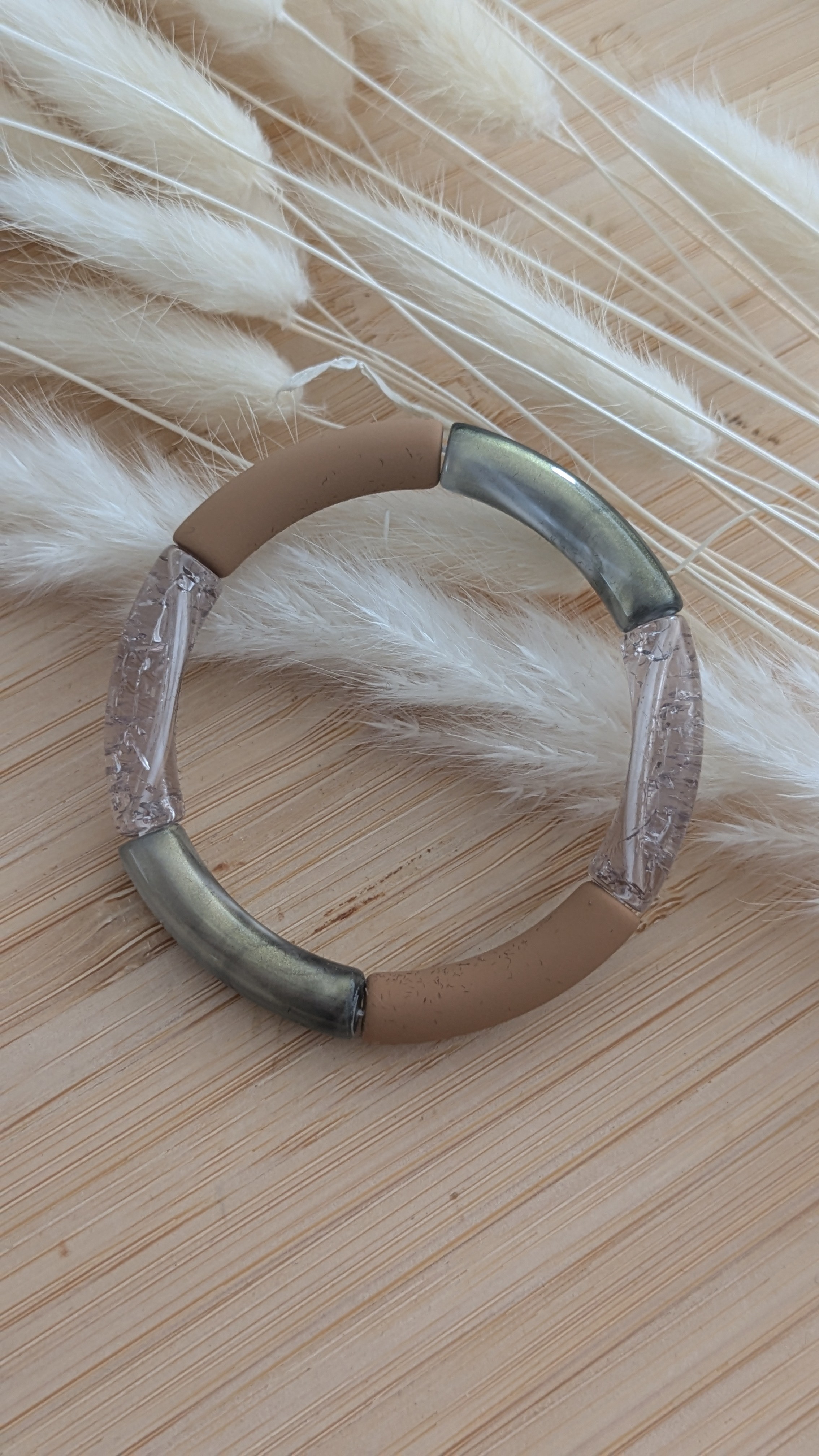Elastique, il s'enfile facilement. Réalisé avec des perles acryliques lisses et craquelées pour un effet dynamique et texturé.