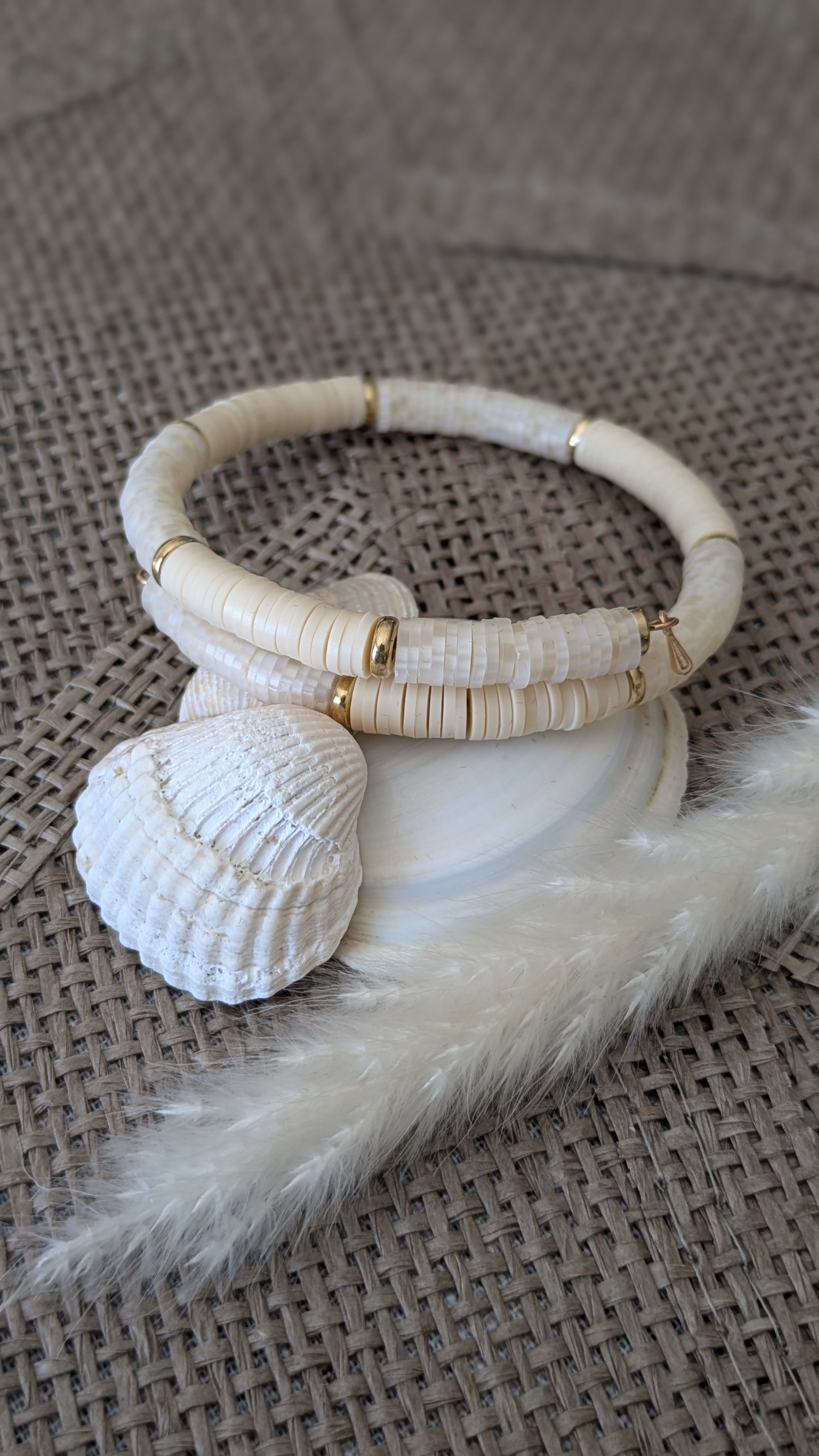 Bracelet de la Collection Vibes, fait main en perles Heishi plates, montées sur un fil à mémoire de forme en acier inoxydable. Chaque modèle mixe teintes vitaminées ou pastels, réhaussées de rangs dorés pour une touche chic.