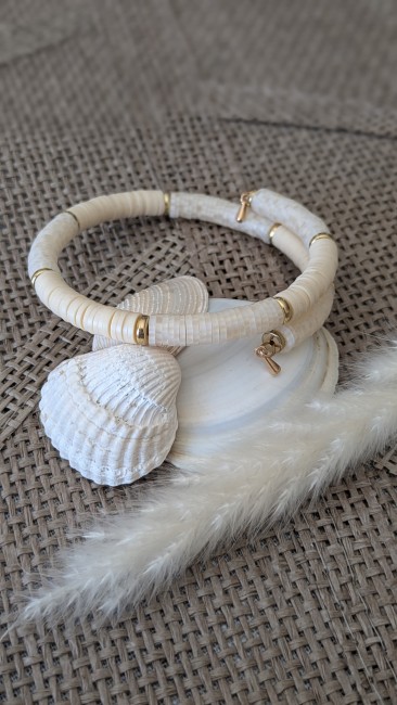 Un bracelet nacré réhaussé de touches dorées, comme la mousse des vagues sous les rayons du soleil.