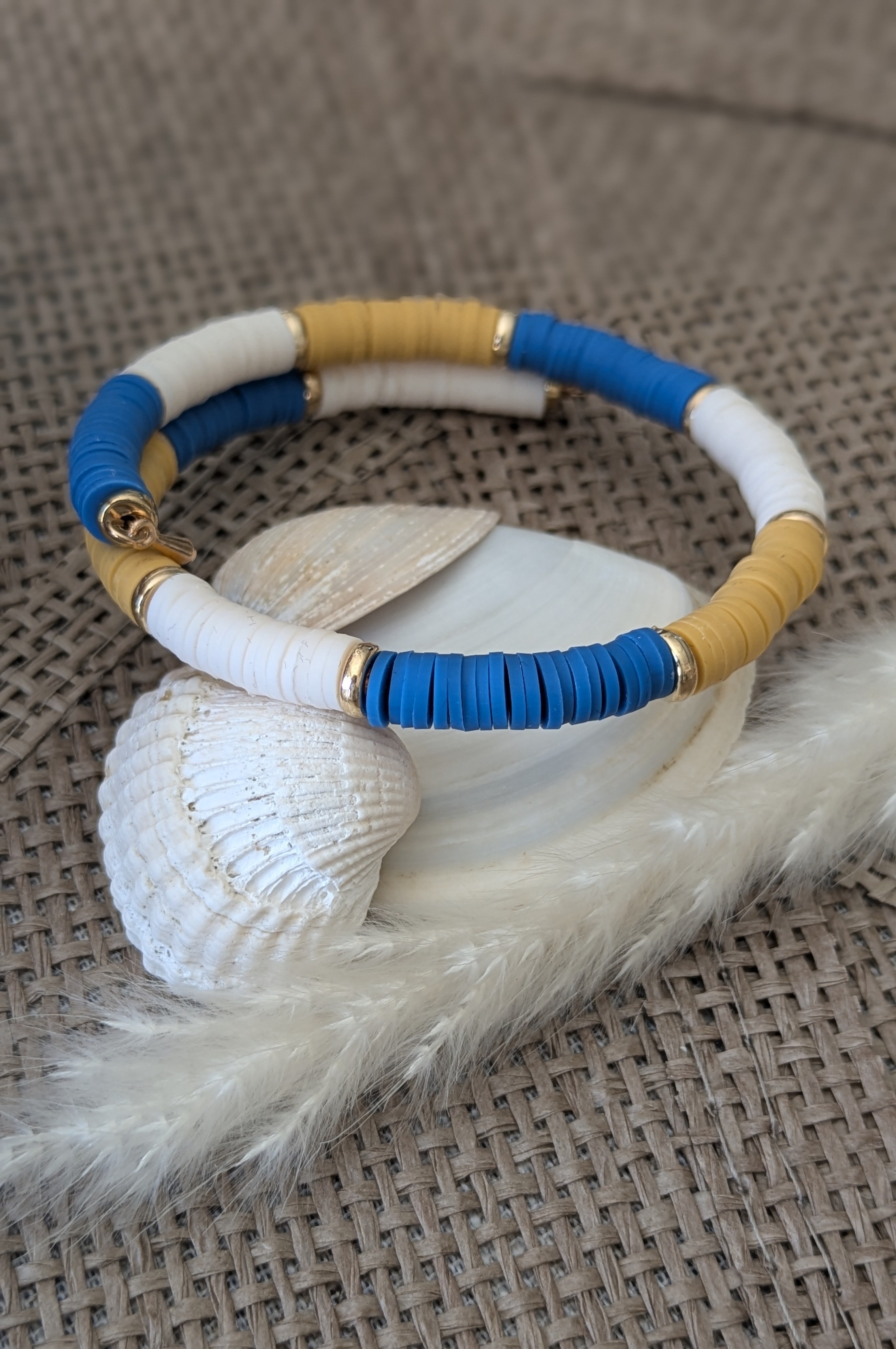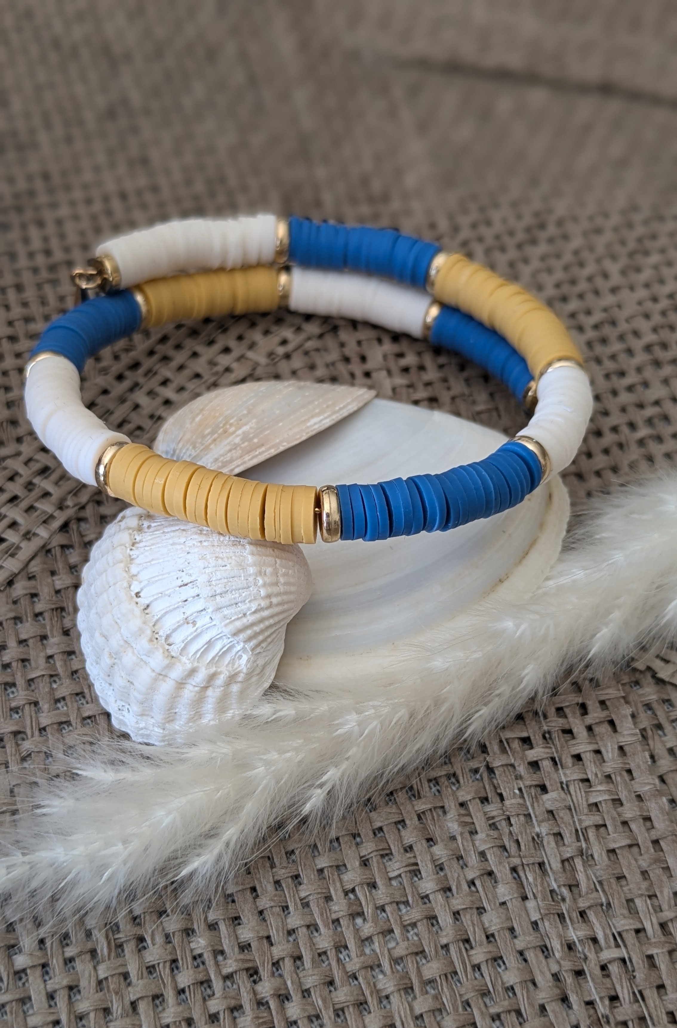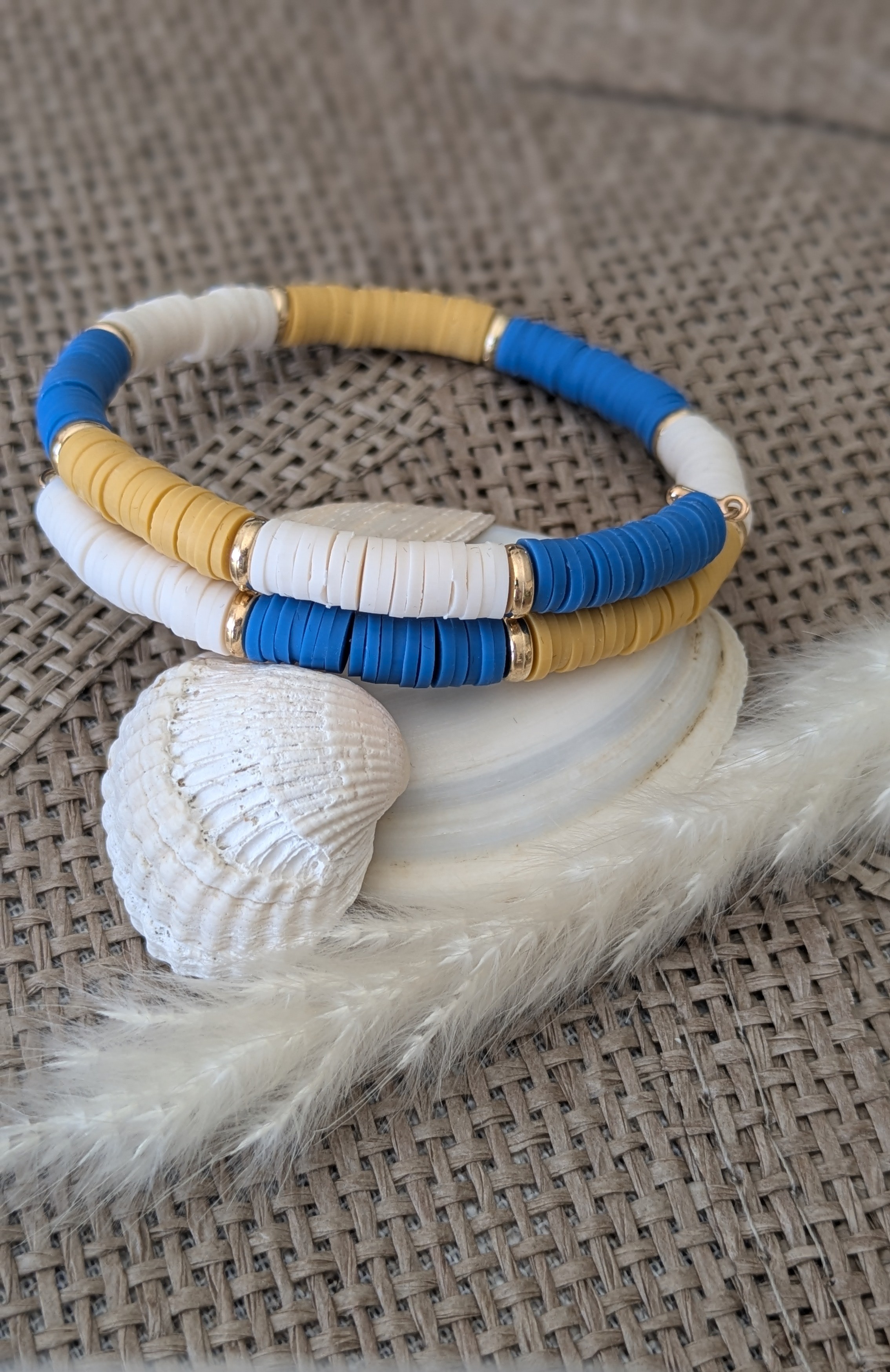 Bracelet de la Collection Vibes, fait main en perles Heishi plates, montées sur un fil à mémoire de forme en acier inoxydable. Chaque modèle mixe teintes vitaminées ou pastels, réhaussées de rangs dorés pour une touche chic.