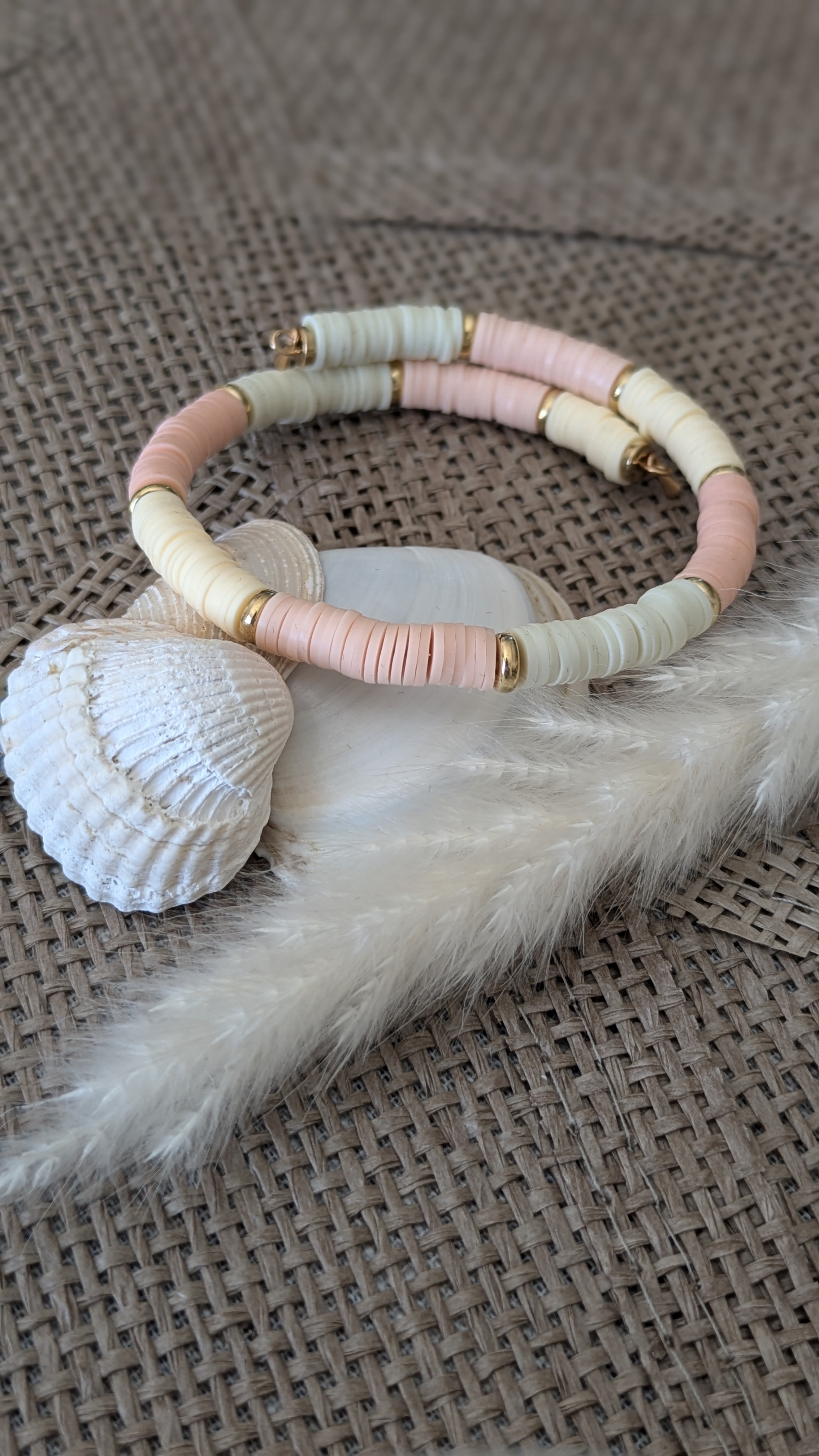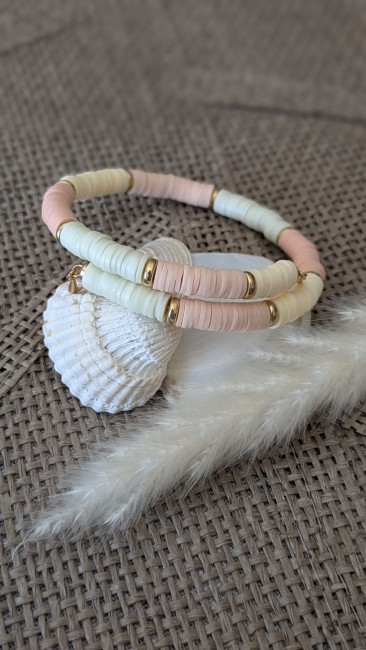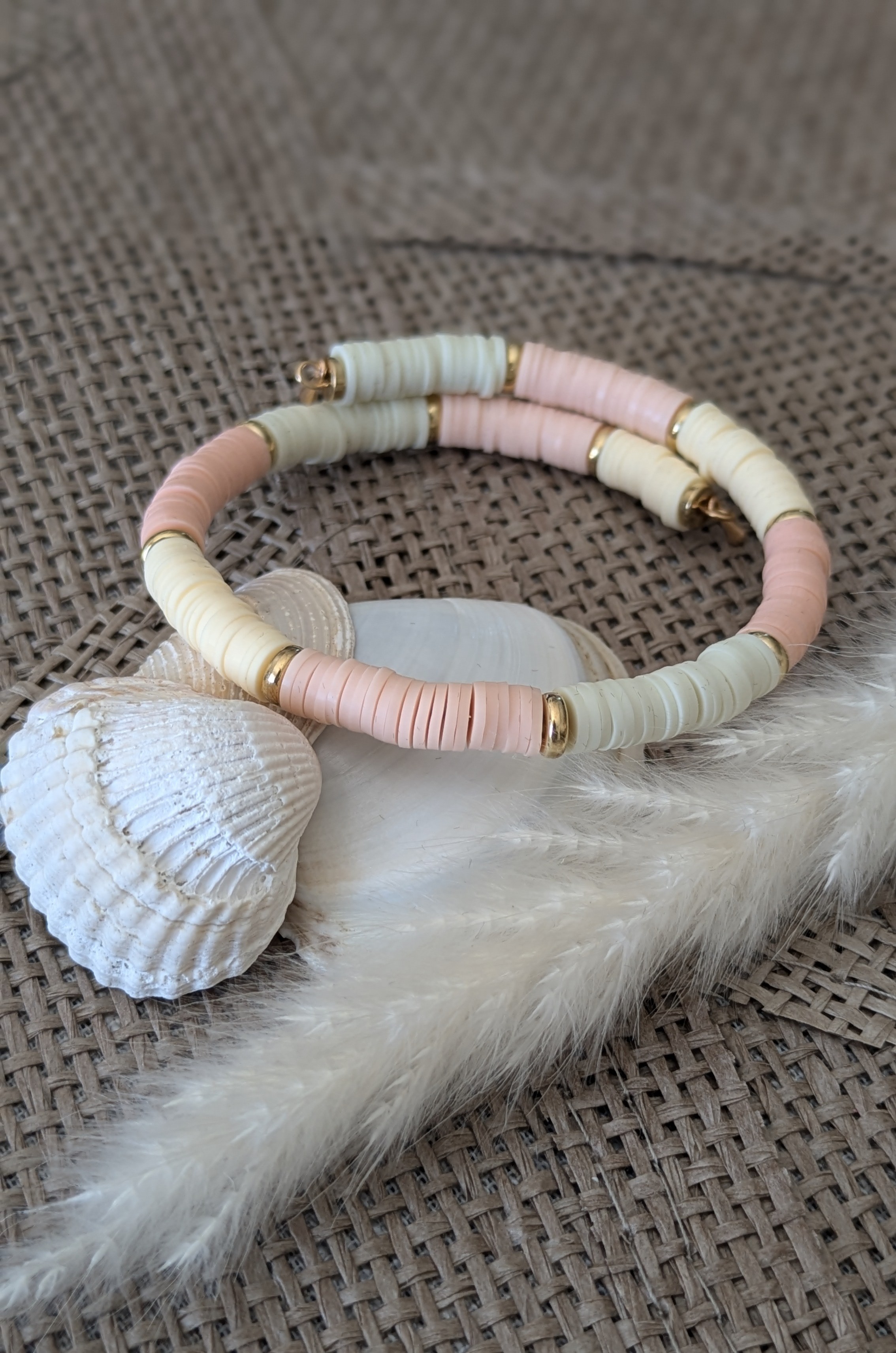Bracelet de la Collection Vibes, fait main en perles Heishi plates, montées sur un fil à mémoire de forme en acier inoxydable. Chaque modèle mixe teintes vitaminées ou pastels, réhaussées de rangs dorés pour une touche chic.
