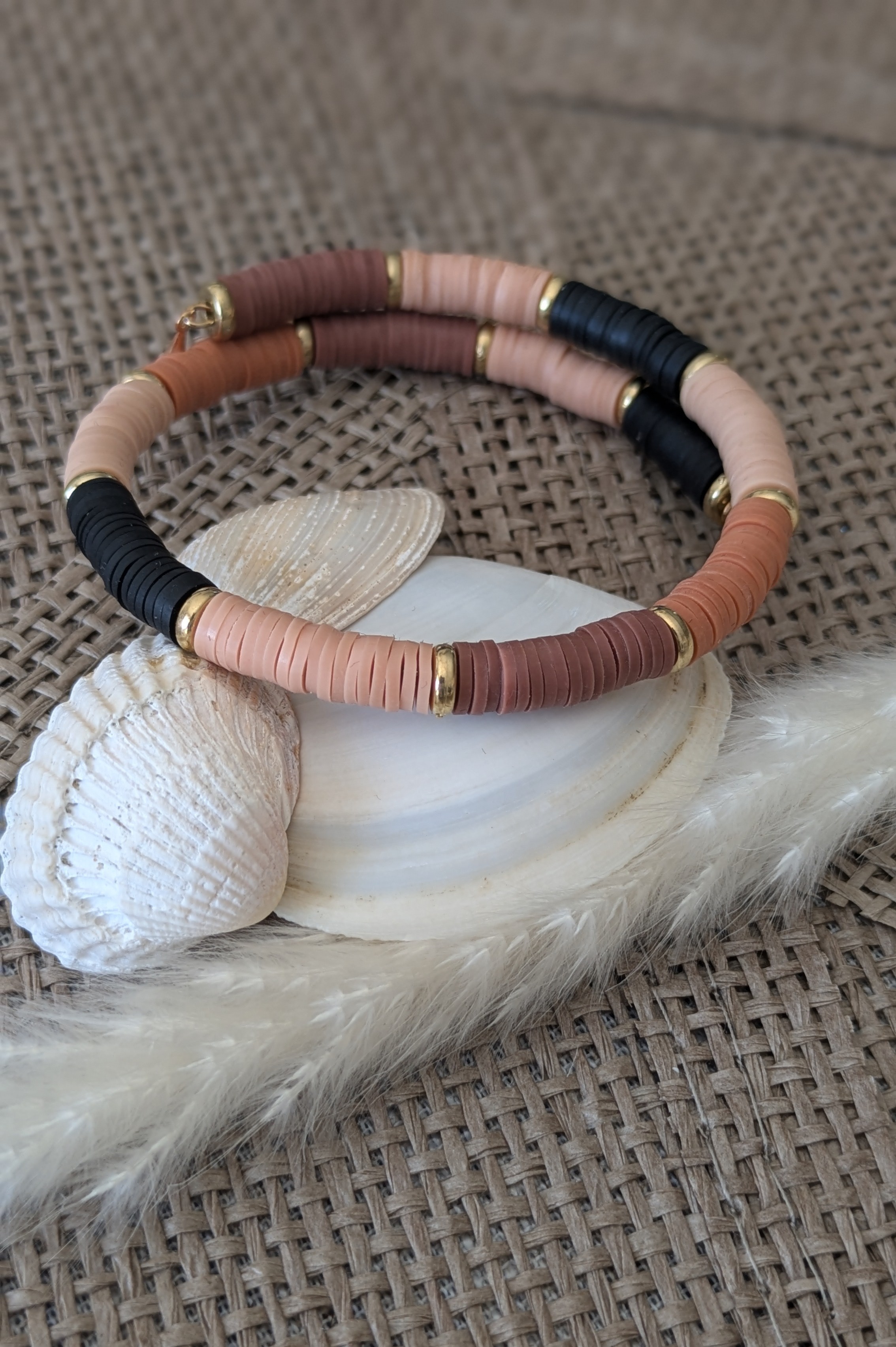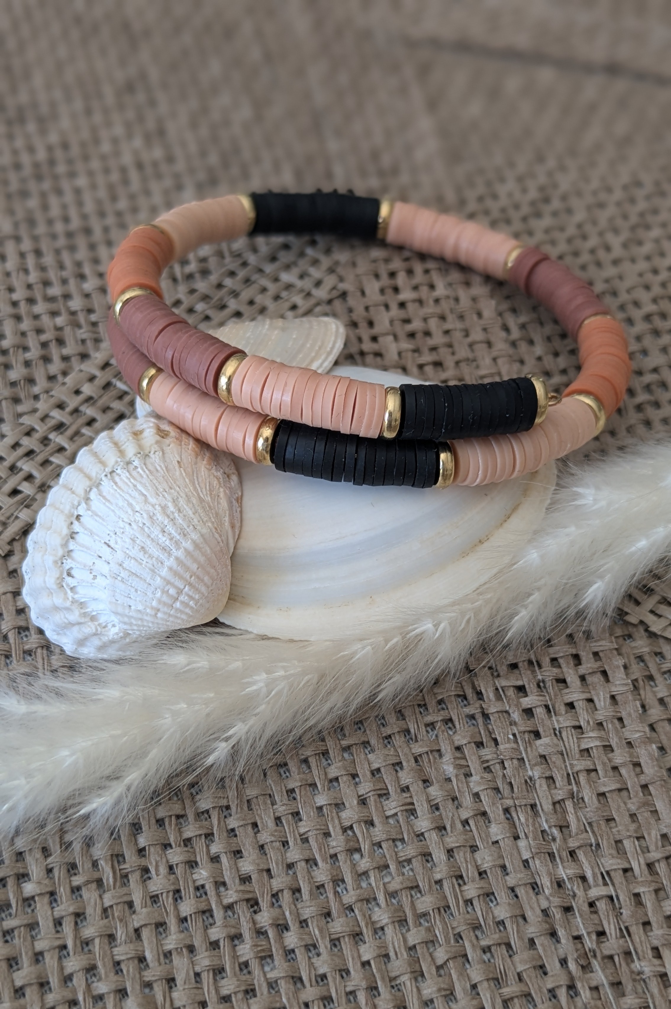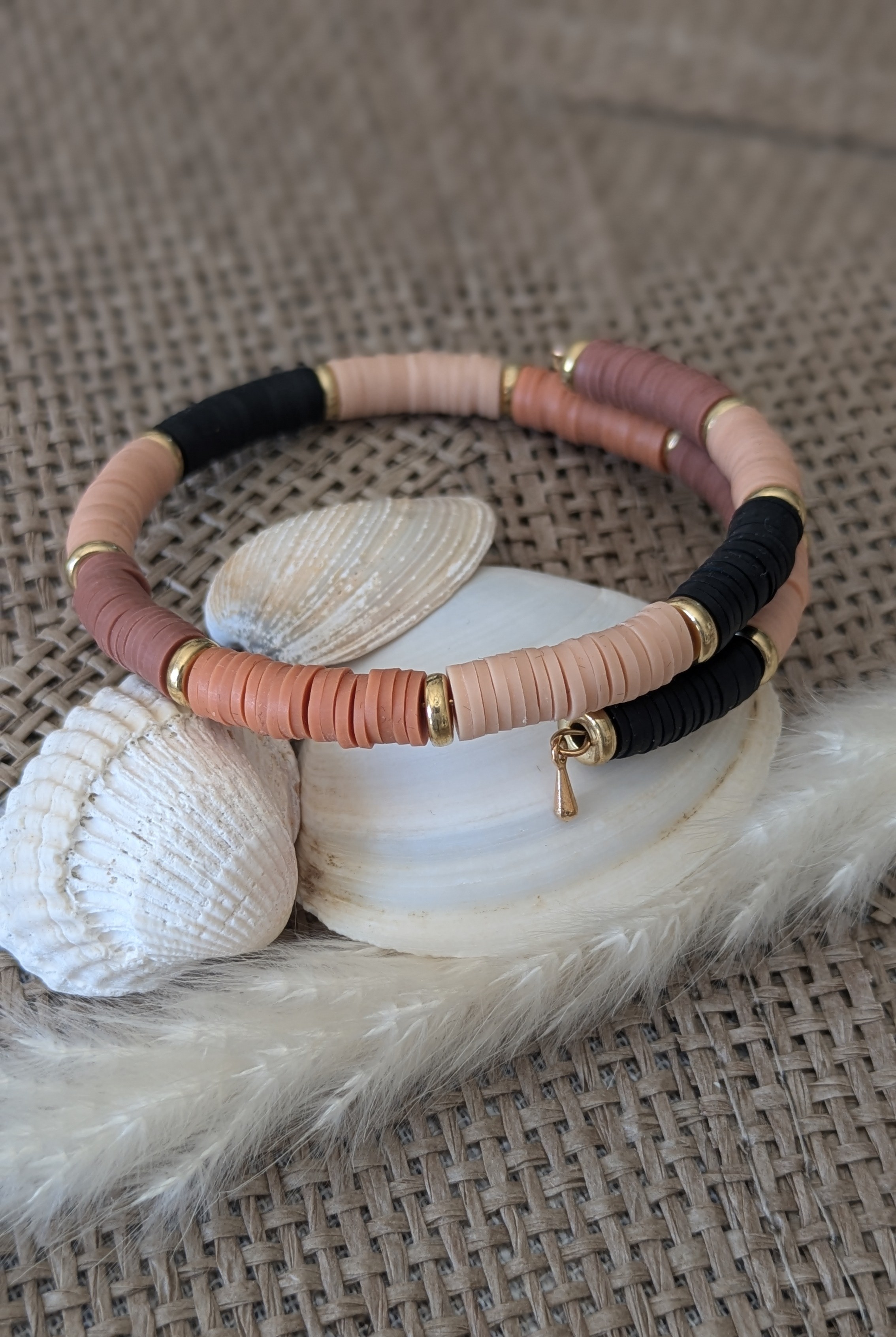 Bracelet de la Collection Vibes, fait main en perles Heishi plates, montées sur un fil à mémoire de forme en acier inoxydable. Chaque modèle mixe teintes vitaminées ou pastels, réhaussées de rangs dorés pour une touche chic.