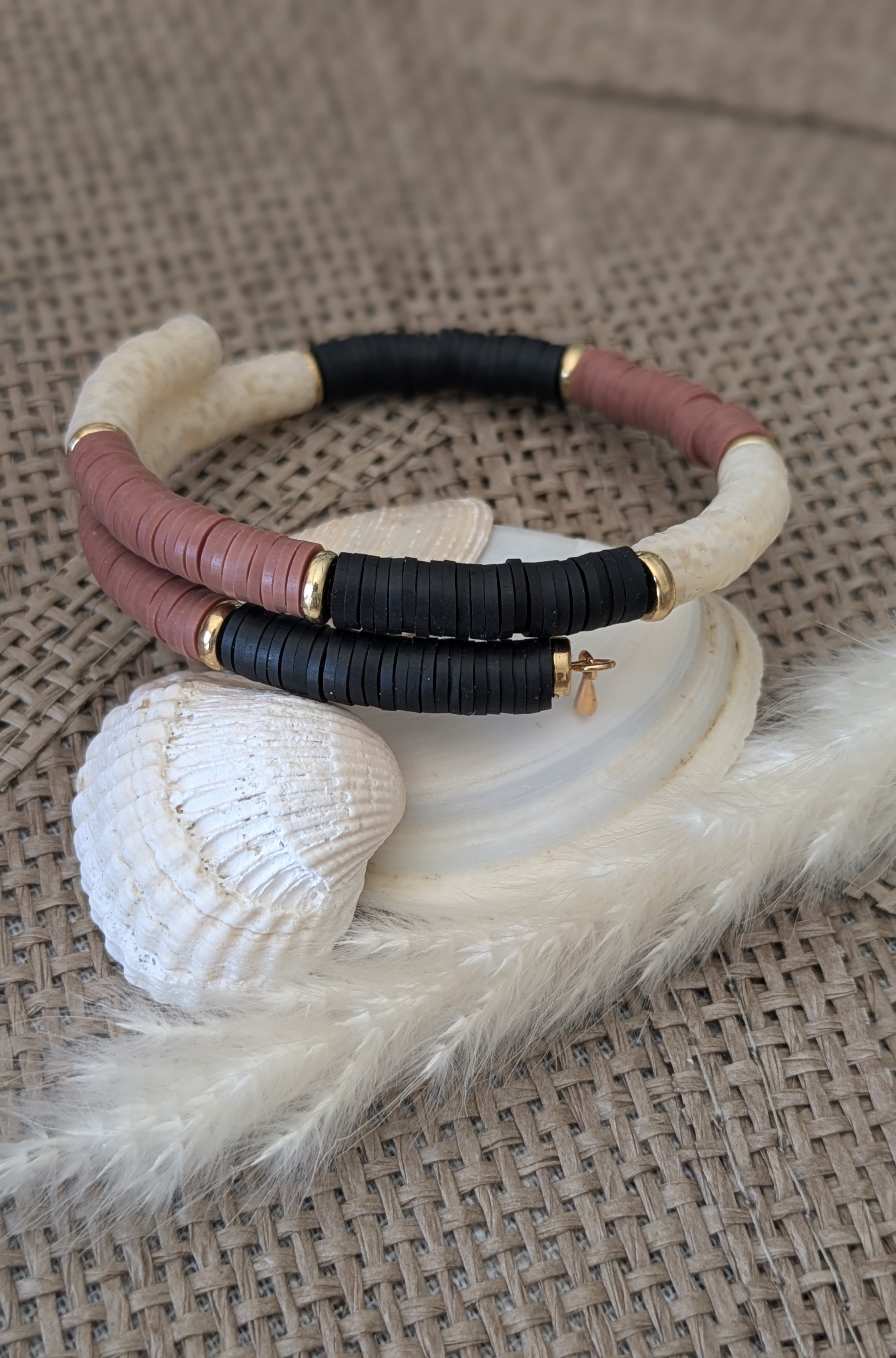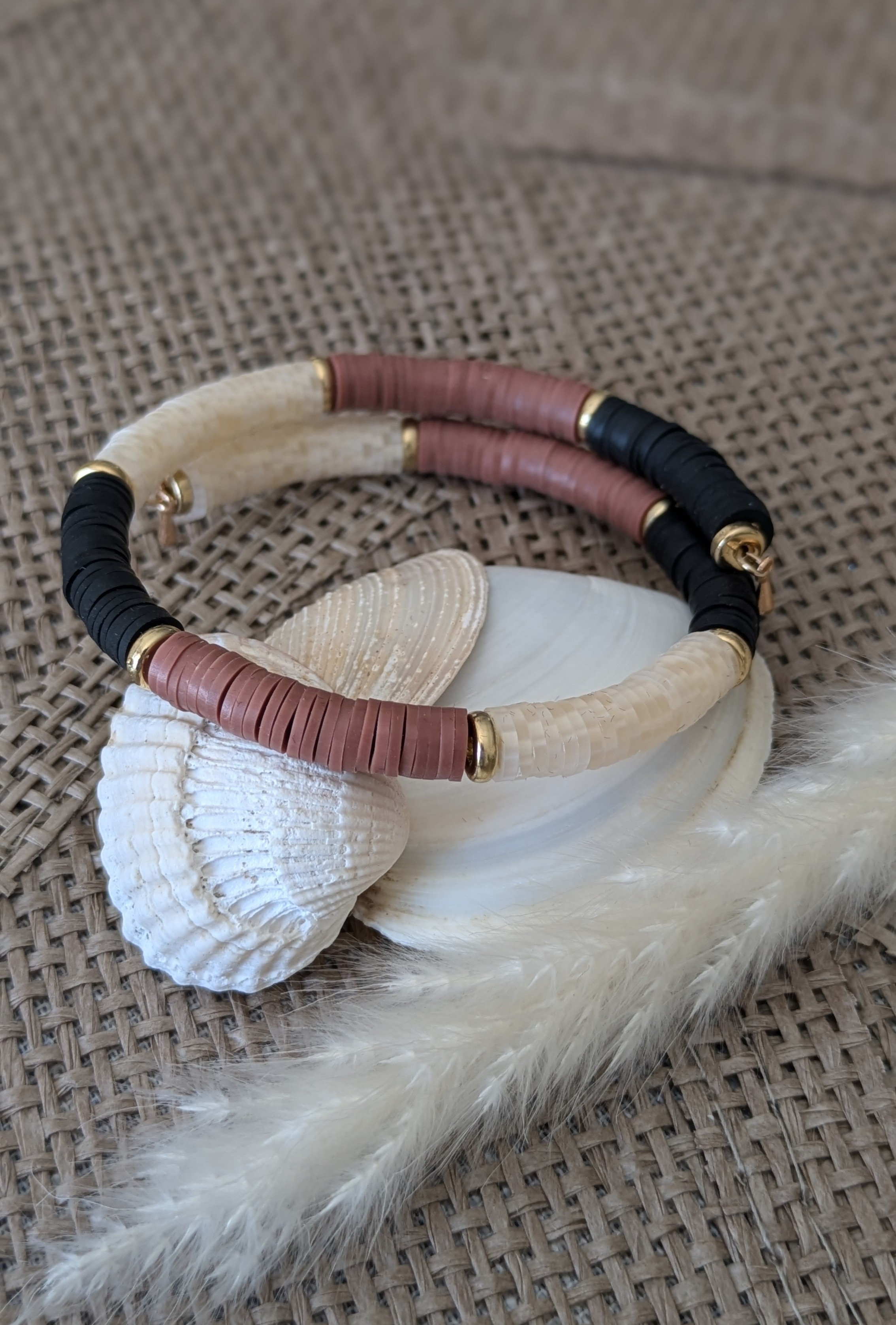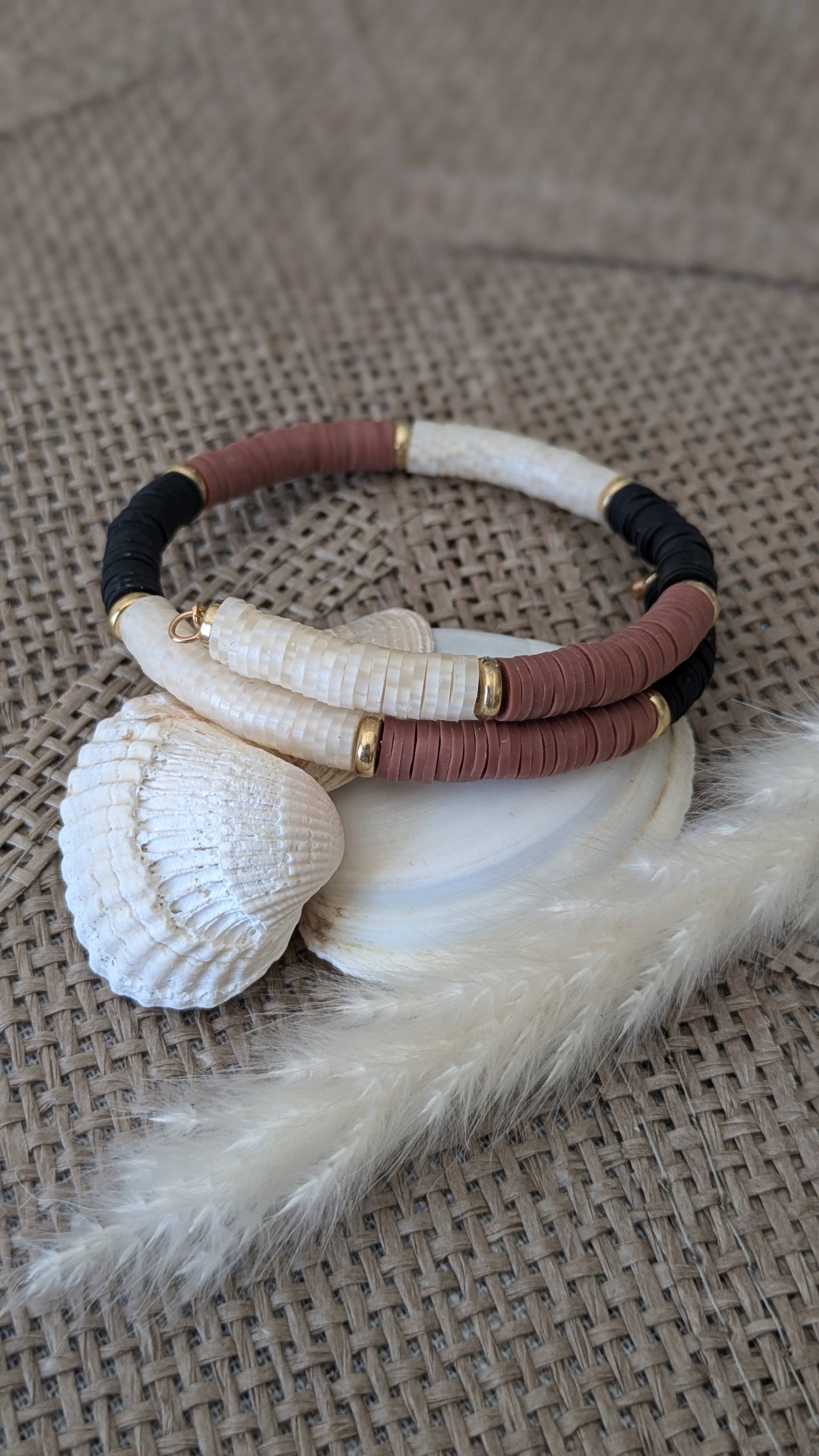 Bracelet de la Collection Vibes, fait main en perles Heishi plates, montées sur un fil à mémoire de forme en acier inoxydable. Chaque modèle mixe teintes vitaminées ou pastels, réhaussées de rangs dorés pour une touche chic.