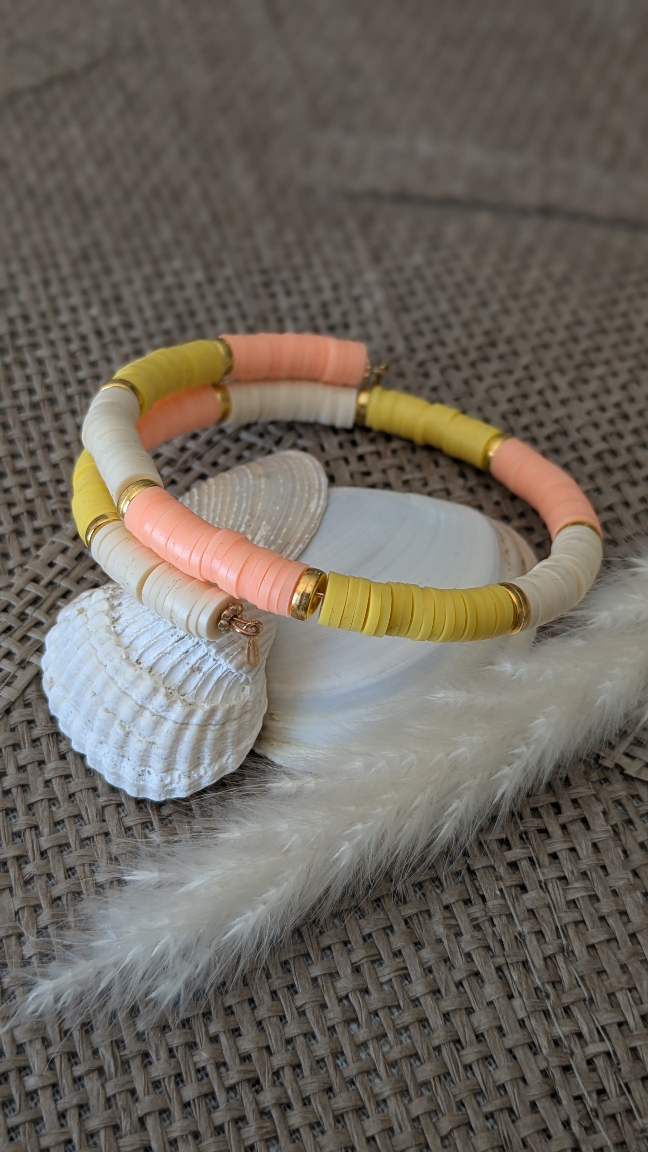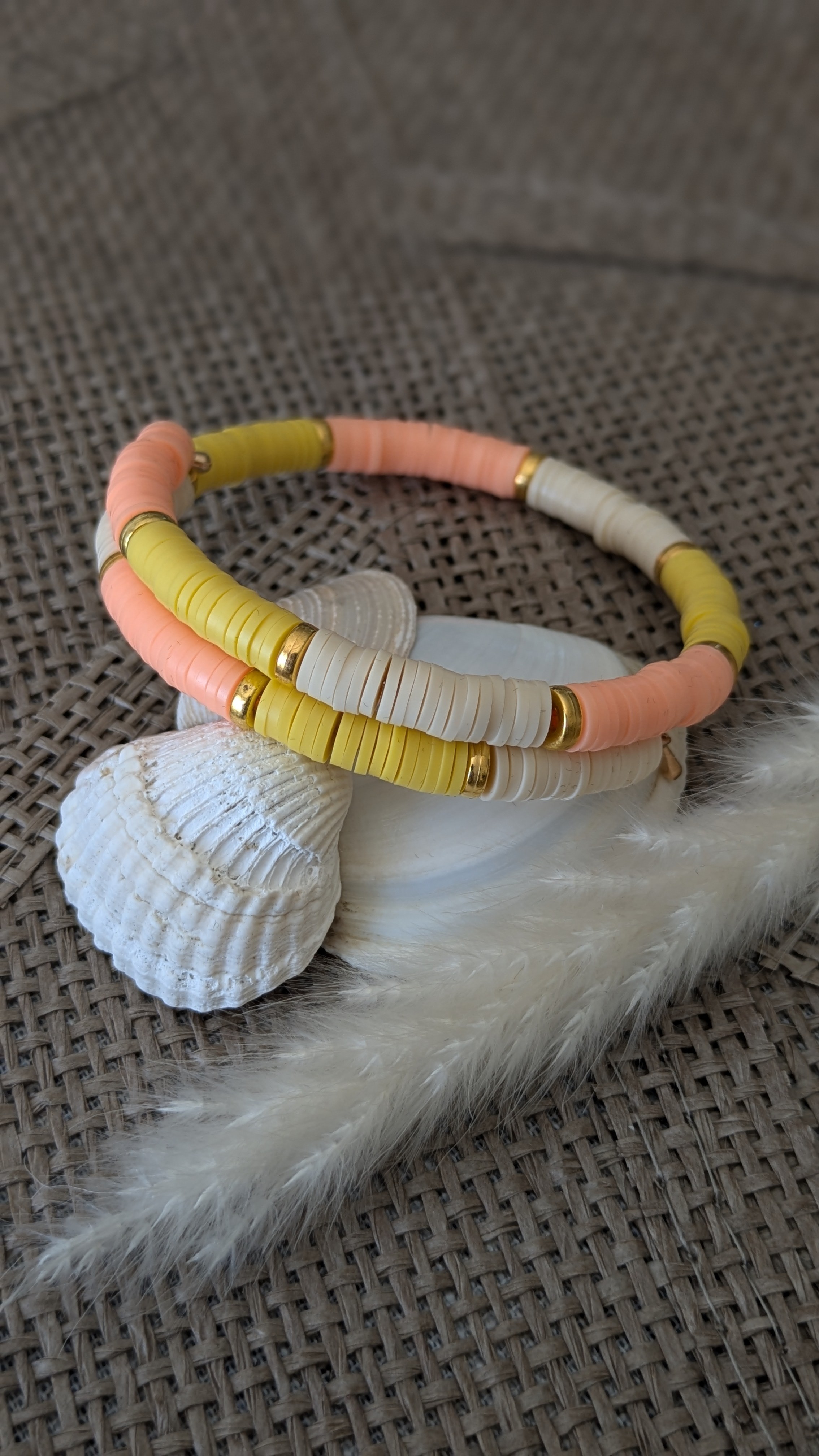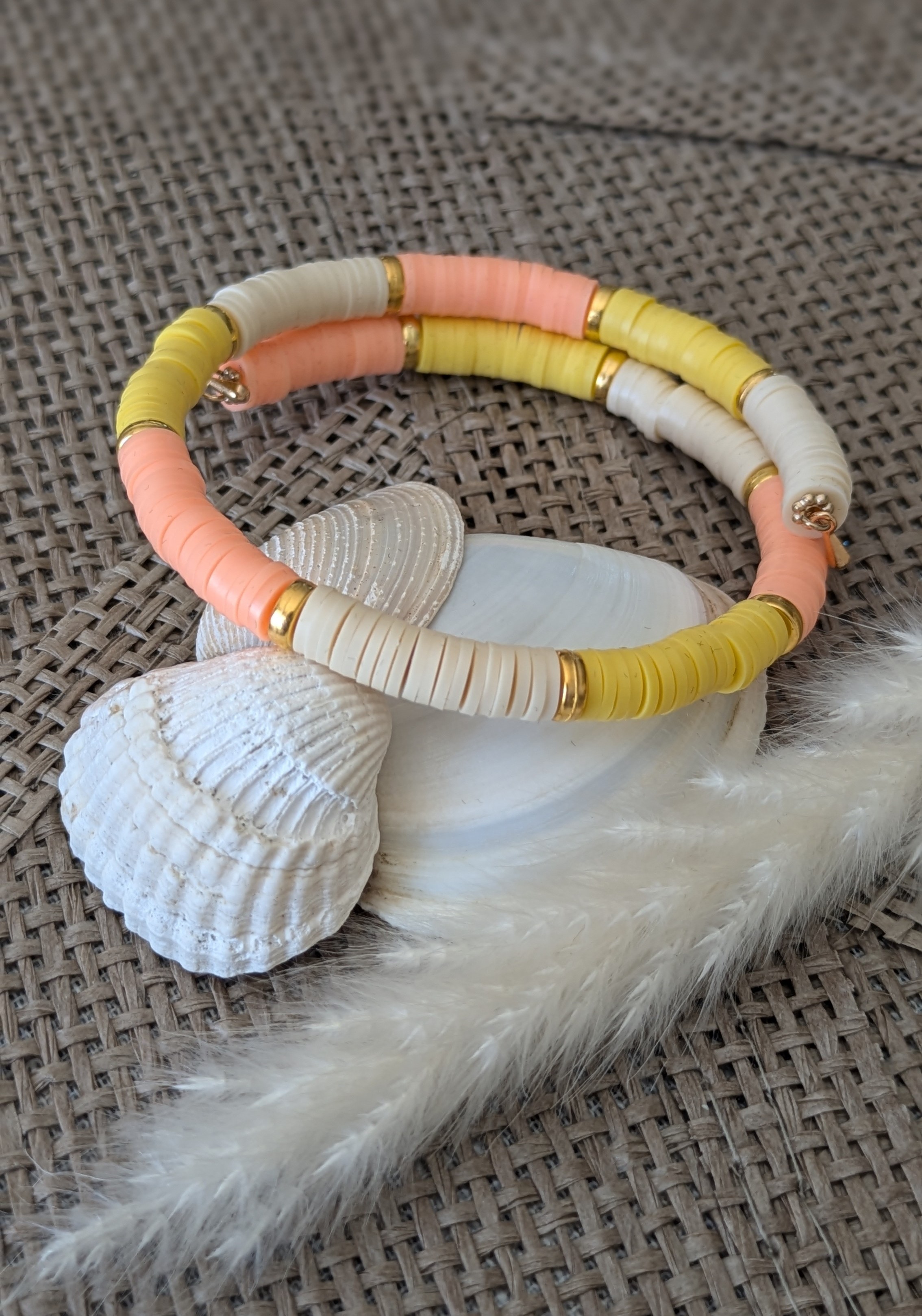 Bracelet de la Collection Vibes, fait main en perles Heishi plates, montées sur un fil à mémoire de forme en acier inoxydable. Chaque modèle mixe teintes vitaminées ou pastels, réhaussées de rangs dorés pour une touche chic.