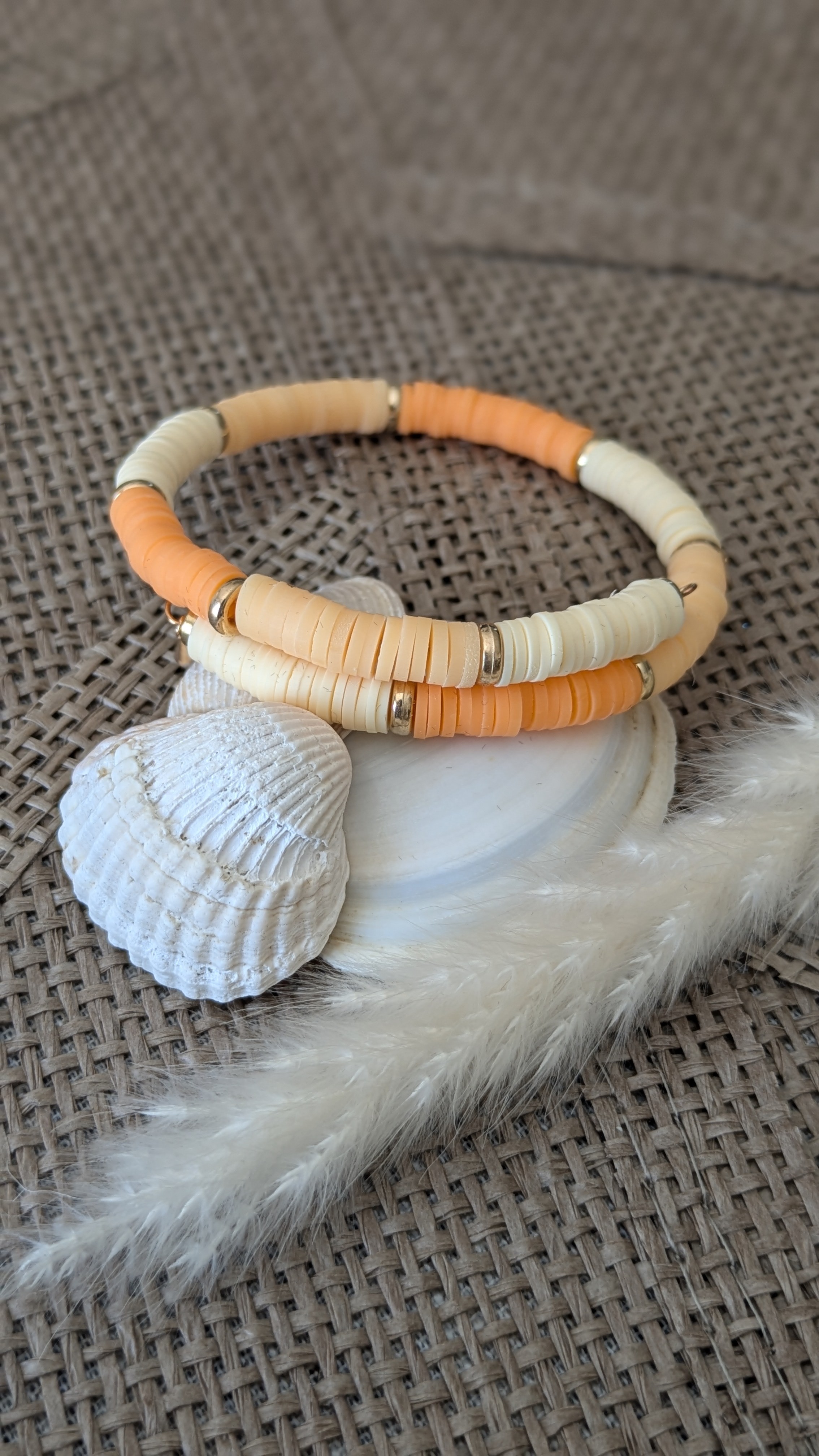 Des tons vanille, pêche et orange, comme un coucher de soleil en mouvement. Un bracelet chaleureux et enveloppant, parfait pour illuminer vos journées.